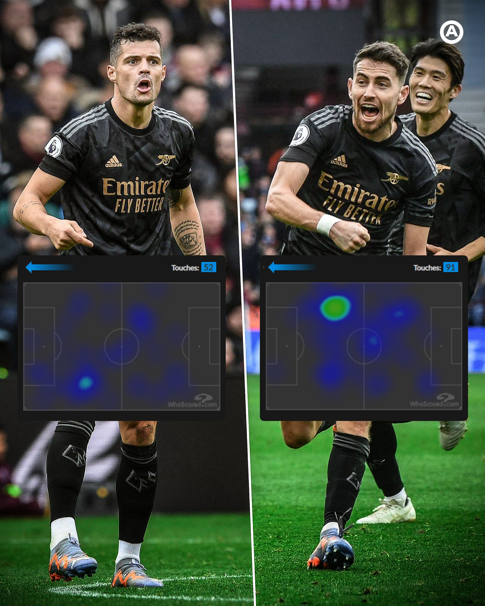 Jorginho chơi trong vai của của Thomas Partey nhưng phần lớn các đường chuyền đầy sáng tạo mà anh tạo ra đều hướng đến vị trí của Bukayo Saka hay Ben White đang di chuyển. Headmaps cũng cho thấy Jorginho chơi lệch hẳn về bên phải.