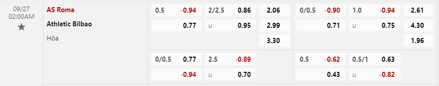 Tỷ lệ kèo AS Roma vs Athletic Bilbao