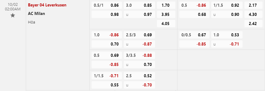 Soi kèo châu Á Bayer Leverkusen vs AC Milan