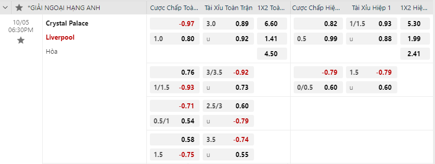 Tỷ lệ kèo Crystal Palace vs Liverpool