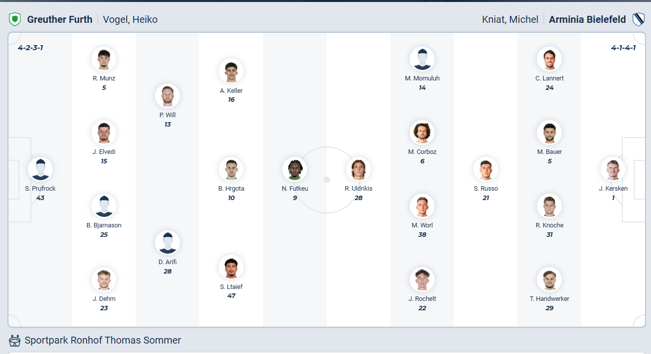 Bielefeld là đội mới thăng hạng mùa giải này sau khi vô địch giải hạng 3 mùa trước, dù không có chất lượng đội hình tốt so với các đội cùng hạng nhưng đội bóng của HLV Michél Kniat đang chơi tốt. Họ leo lên đứng thứ 10 trên bảng xếp hạng sau khi thắng 2 trận liên tiếp vừa qua, nhờ đó cơ hội trụ hạng của các cầu thủ Bielefeld là rất cao và điều họ muốn làm vào lúc này là tiếp tục duy trì chuỗi phong độ đó. Đến làm khách trên sân của đội bóng cuối bảng Greuther Furth không phải trận đấu quá khó khăn, nhiều khả năng Bielefeld sẽ chơi đủ tốt để ra về với 3 điểm trọn vẹn.