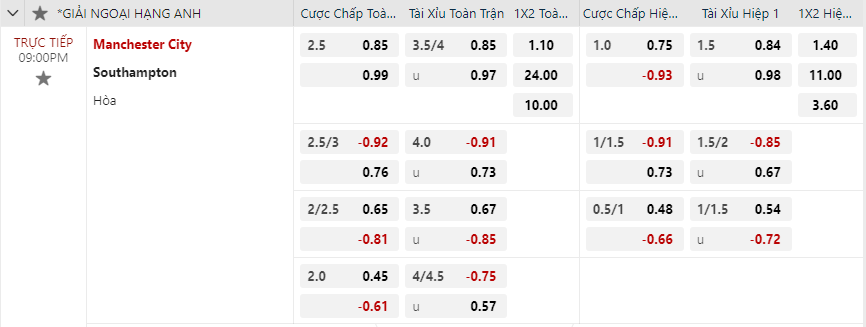 Soi kèo hiệp 1 Manchester City vs Southampton