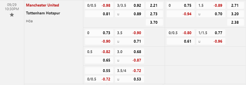 Tỷ lệ kèo Manchester United vs Tottenham Hotspur