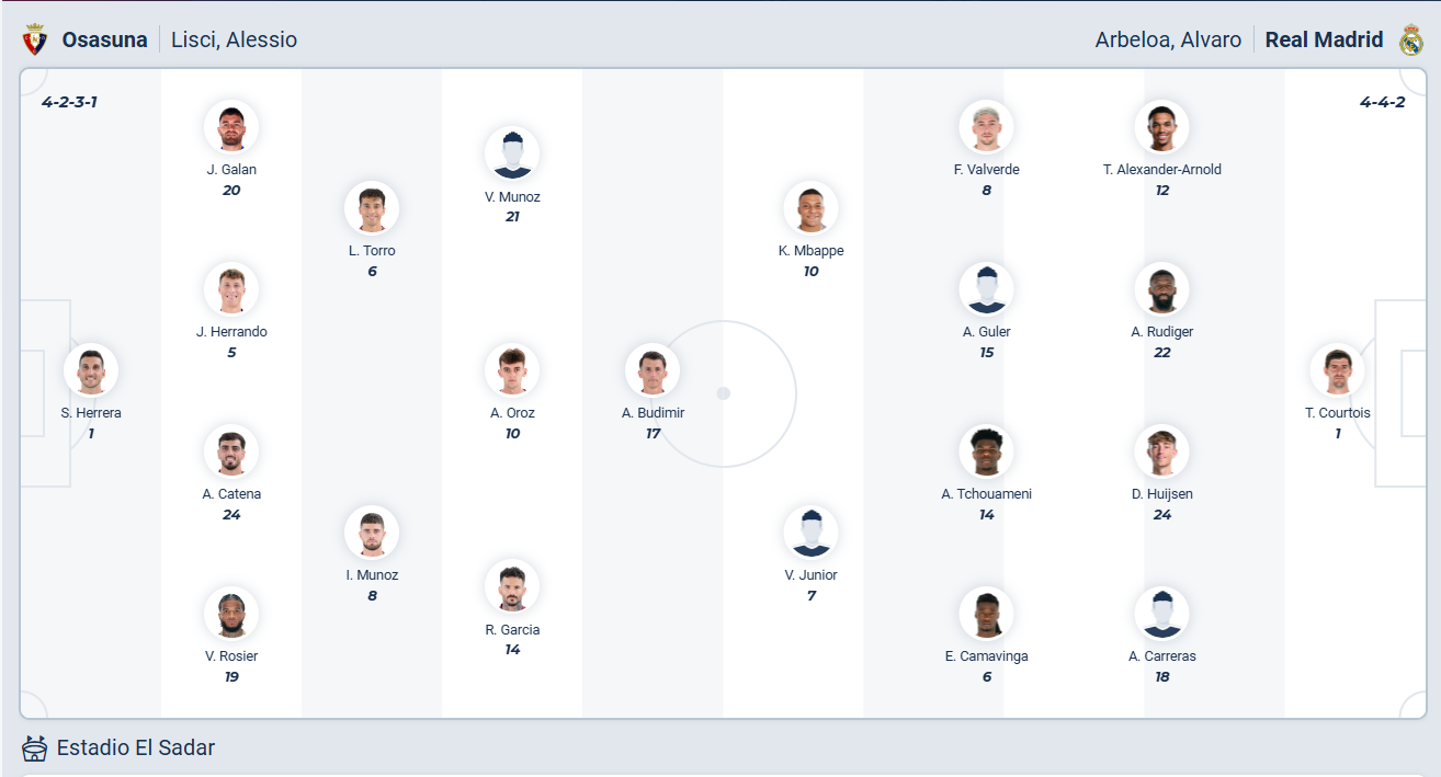 Real Madrid đang có phong độ cực cao khi toàn thắng cả 5 vòng đấu gần nhất, chuỗi phong độ ấn tượng đó giúp đội bóng của HLV Alvaro Arbeloa leo lên đỉnh bảng xếp hạng. Họ cũng vừa thắng trong trận lượt đi vòng play off Champions League nên hoàn toàn tự tin vào một kết quả tốt ở vòng đấu thứ 25 này để duy trì ngôi đầu bảng của mình. Đến làm khách trên sân của Osasuna không phải trận đấu dễ dàng nhưng nhiều khả năng đội hình mạnh hơn cùng phong độ cao sẽ giúp các cầu thủ khách chơi tốt, qua đó ra về với 3 điểm trọn vẹn.