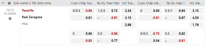 Soi kèo châu Á Tenerife vs Real Zaragoza
