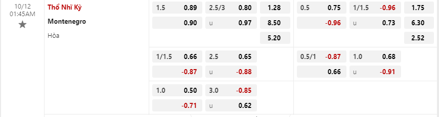 Tỷ lệ kèo Thổ Nhĩ Kỳ vs Montenegro